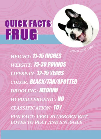 They are normally around the same size as a French Bulldog, averaging 25 pounds and 13 inches high. Frugs are great lap dogs.